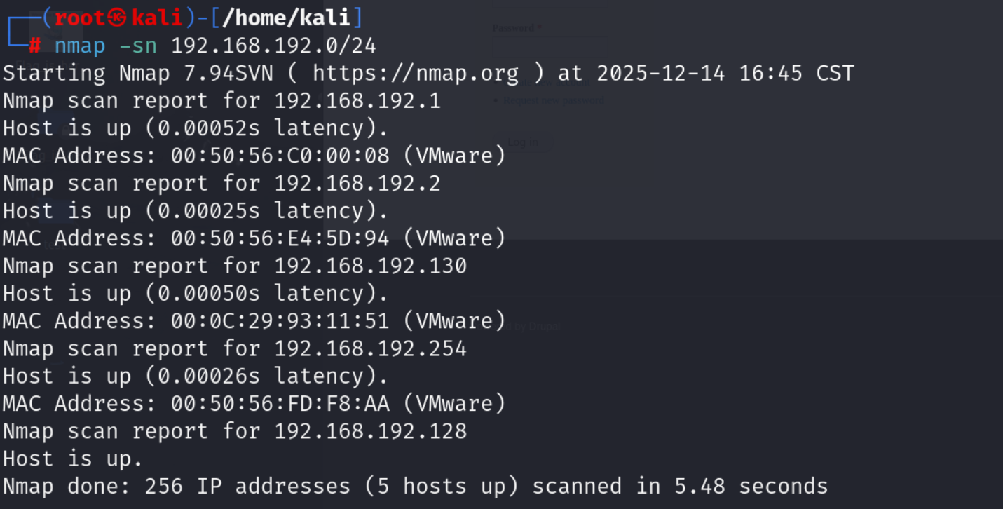 payload:nmap -sn 192.168.192.0/24分析反馈内容: